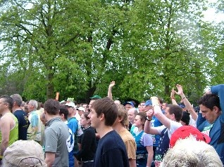 Well his hand. It's the one in the air above the bloke wearing a dark